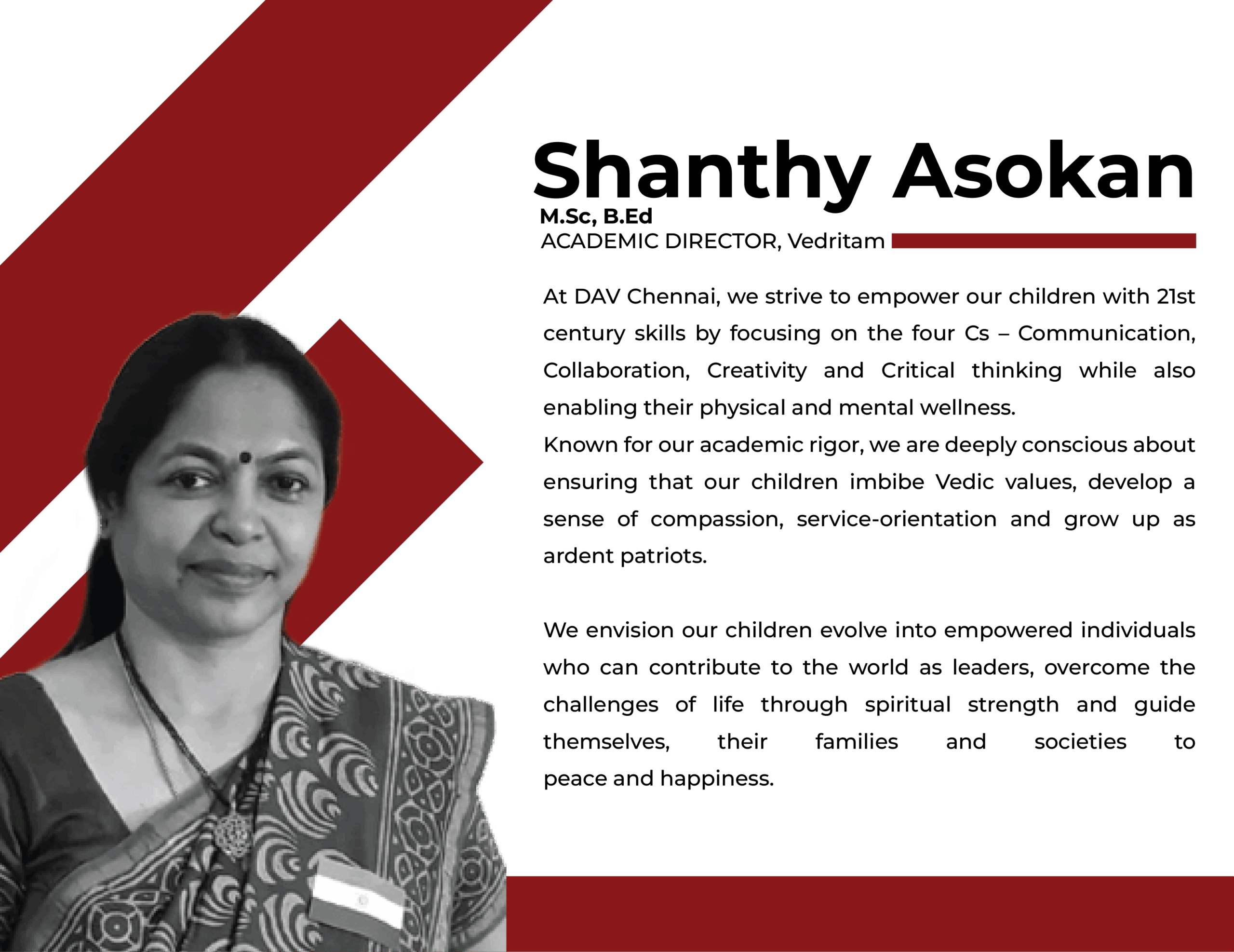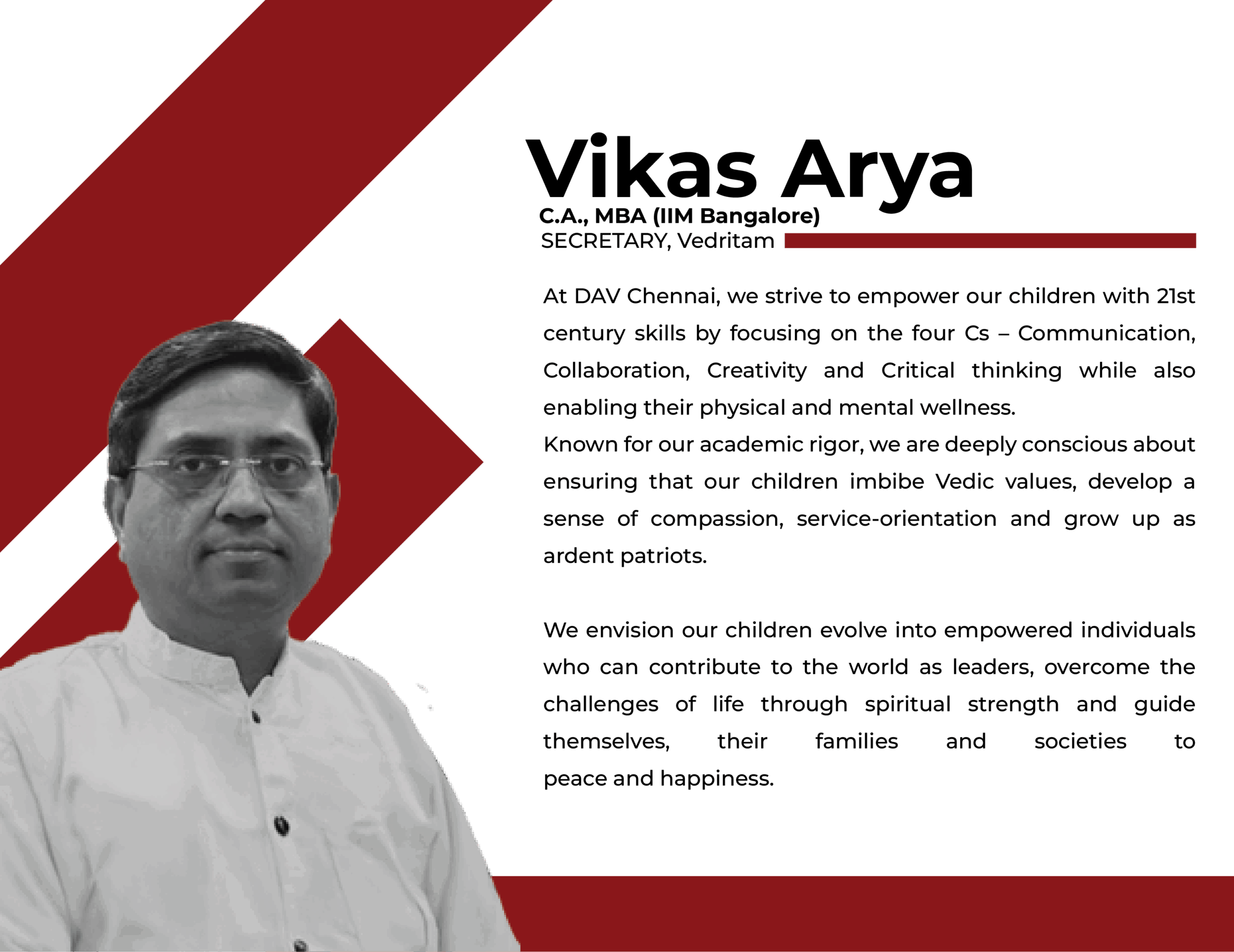 Empower learners to gain competency across the spiritual, intellectual and physical aspects of life by consistently delivering high quality, affordable and value-oriented education based on Vedic principles.